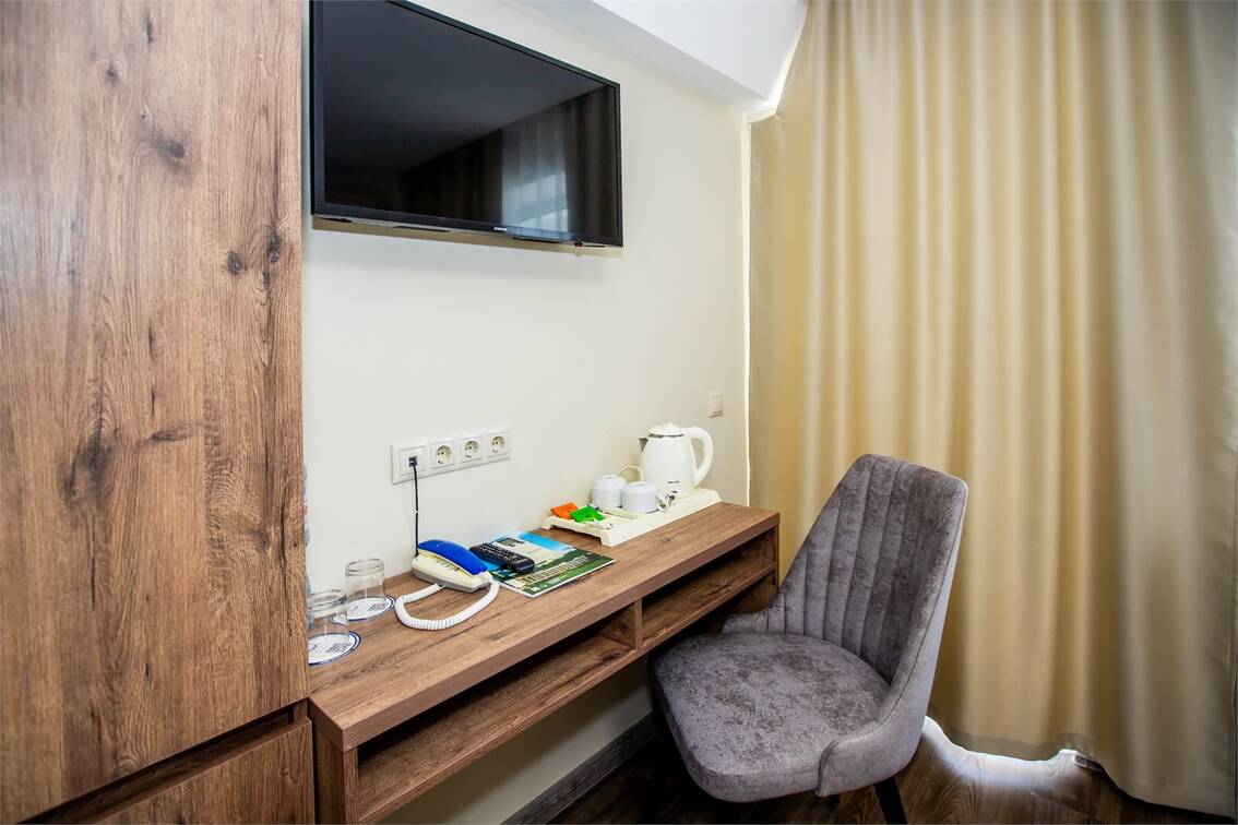 Кресло, Тапочки, Халат, Чайник, Бесплатный Wi-Fi, Ванная комната, Кондиционер/Сплит-система, Мини-бар, Прикроватная тумбочка, Спутниковые каналы, Стол, Стул/Стулья, Телевизор, Телефон, Туалетные принадлежности, Фен, Шкаф, Журнальный столик, Диван-кровать, Зеркало, Кровати односпальные, Набор одноразовой косметики, Посуда
